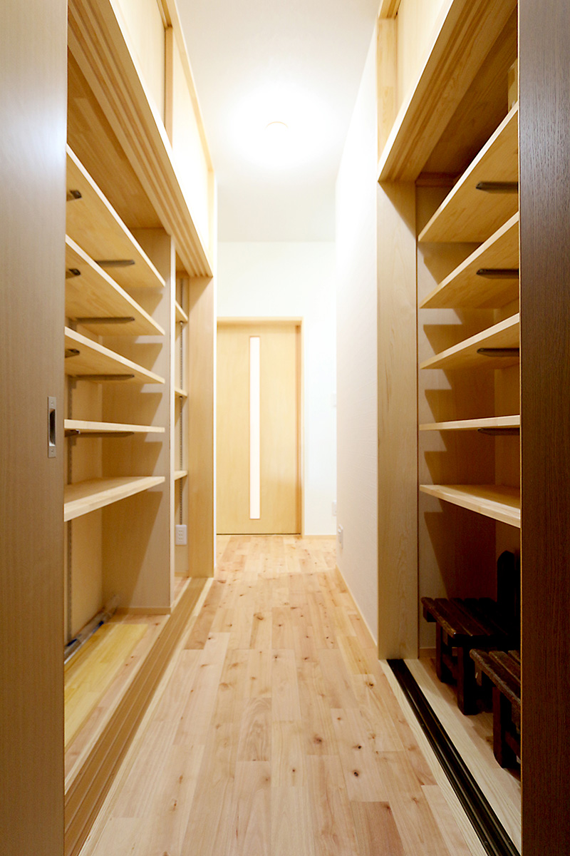 廊下を単なる通路とせず、収納や読書コーナーなど多目的に活用。