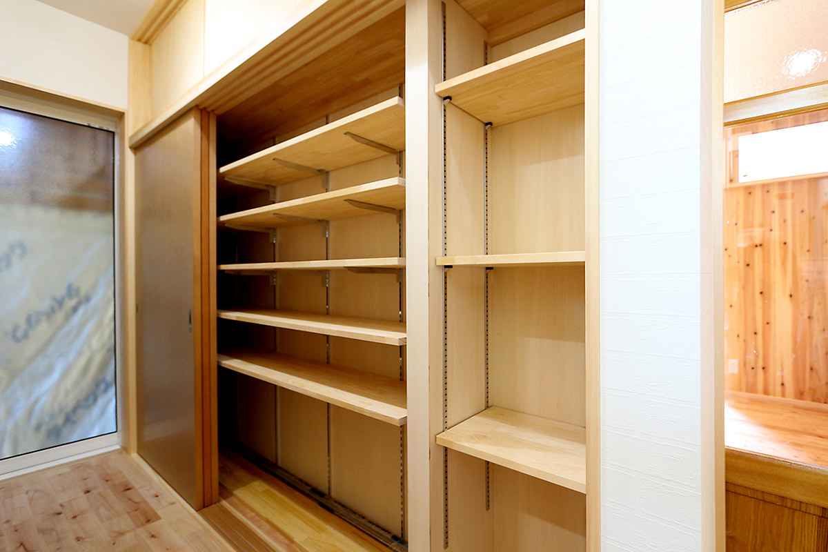 掃除機などをサッと出し入れできるオープン収納や、造作本棚も備え、