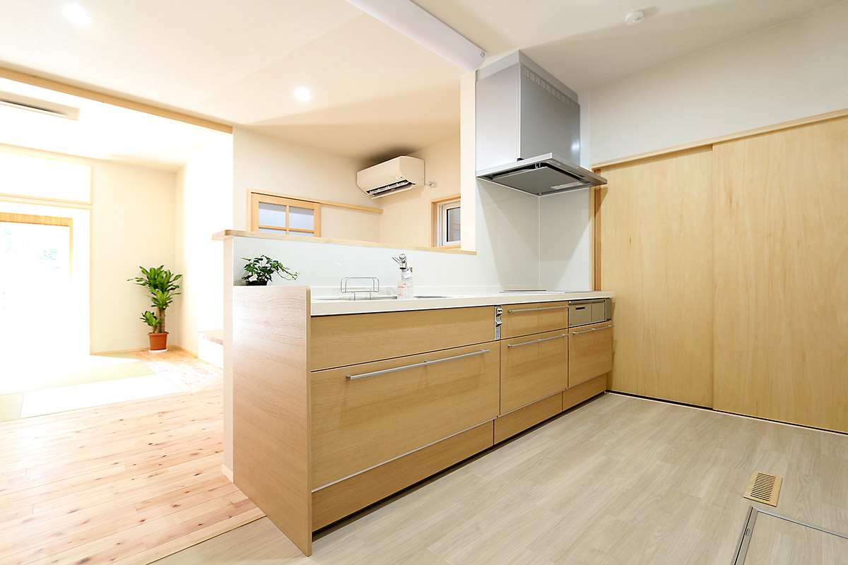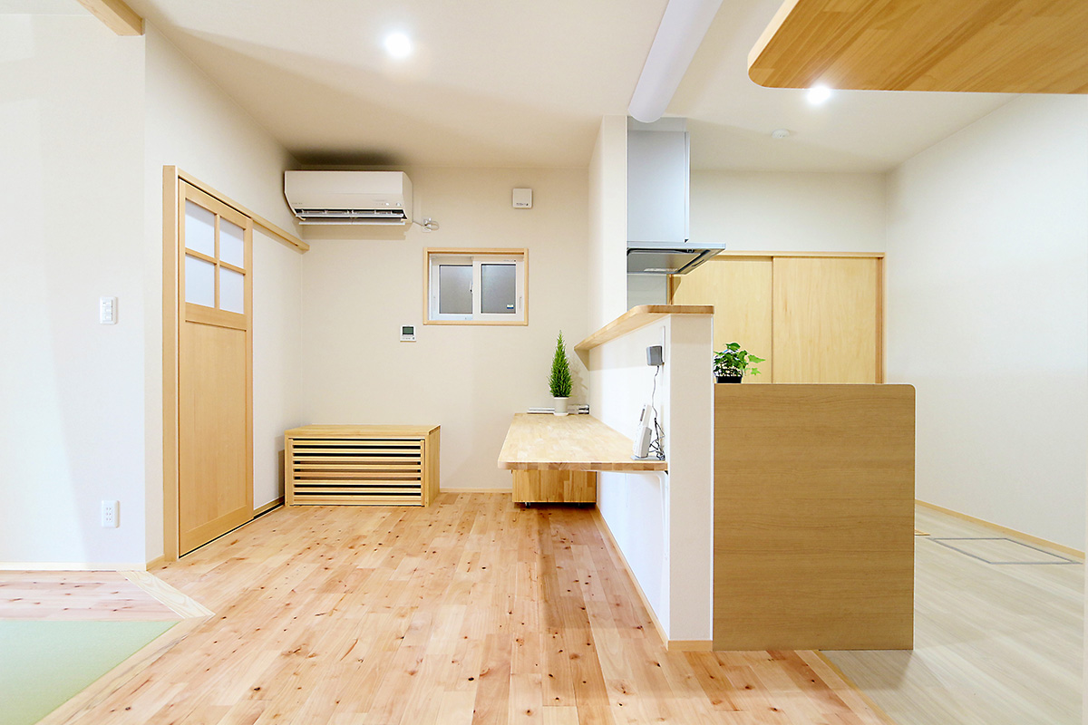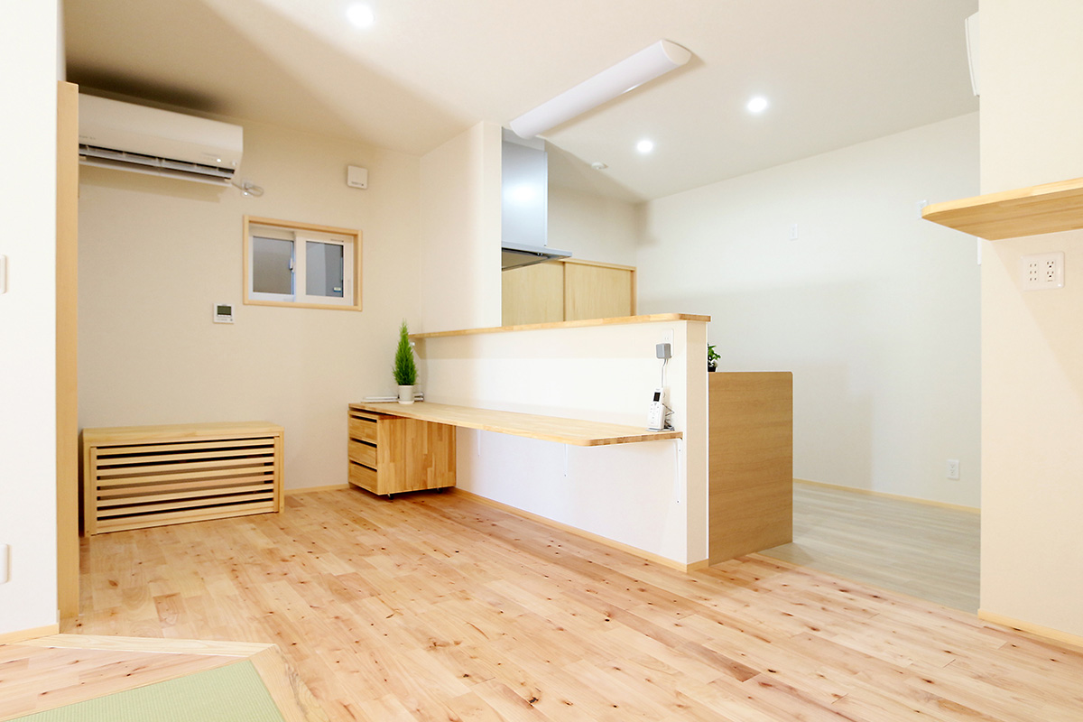 LDKにはカウンター付きの対面キッチンを設け、配膳動線も短くスムーズに。