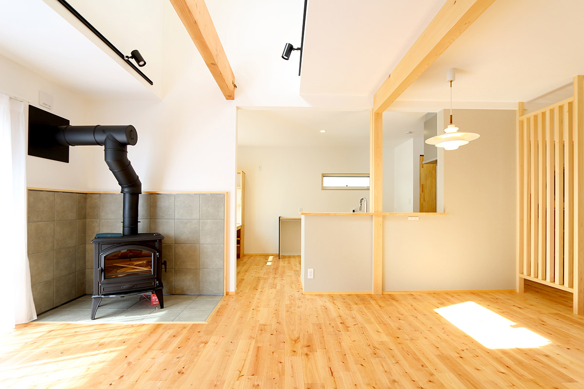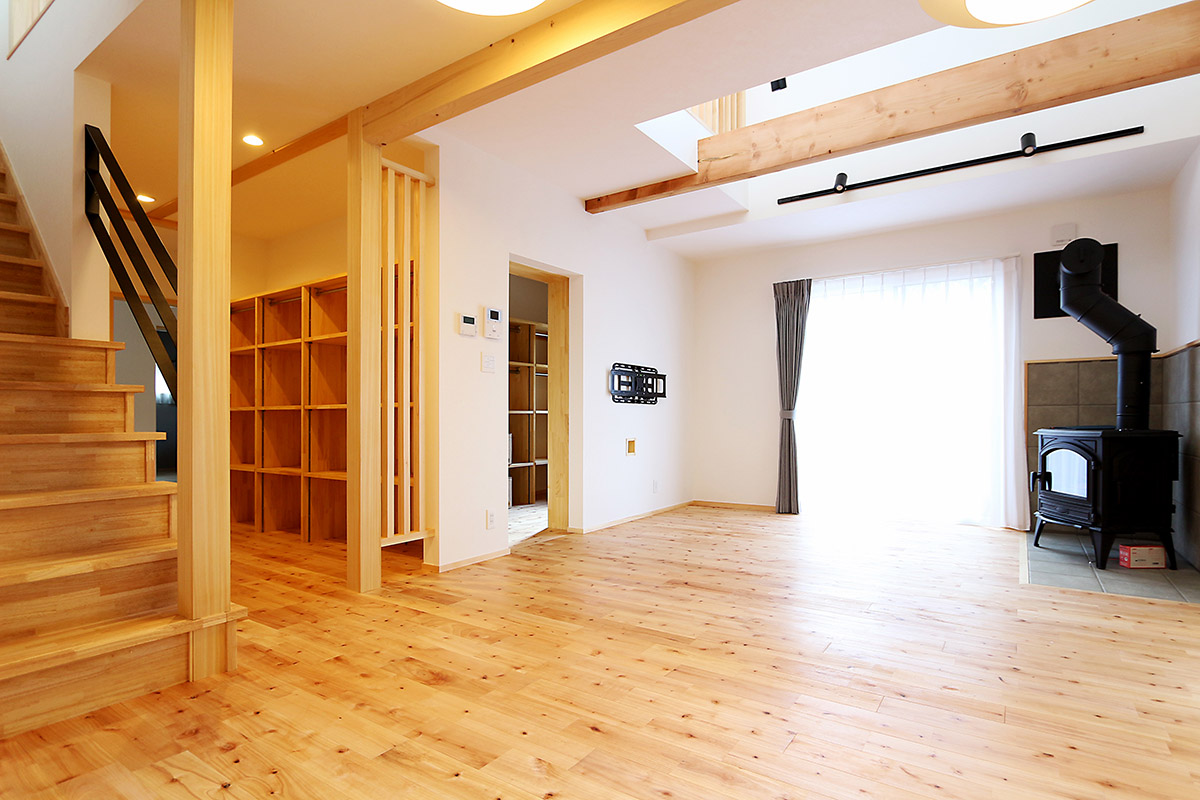 吹き抜けや薪ストーブのあるLDK、書棚のある7.9帖の2階フリースペースなど、