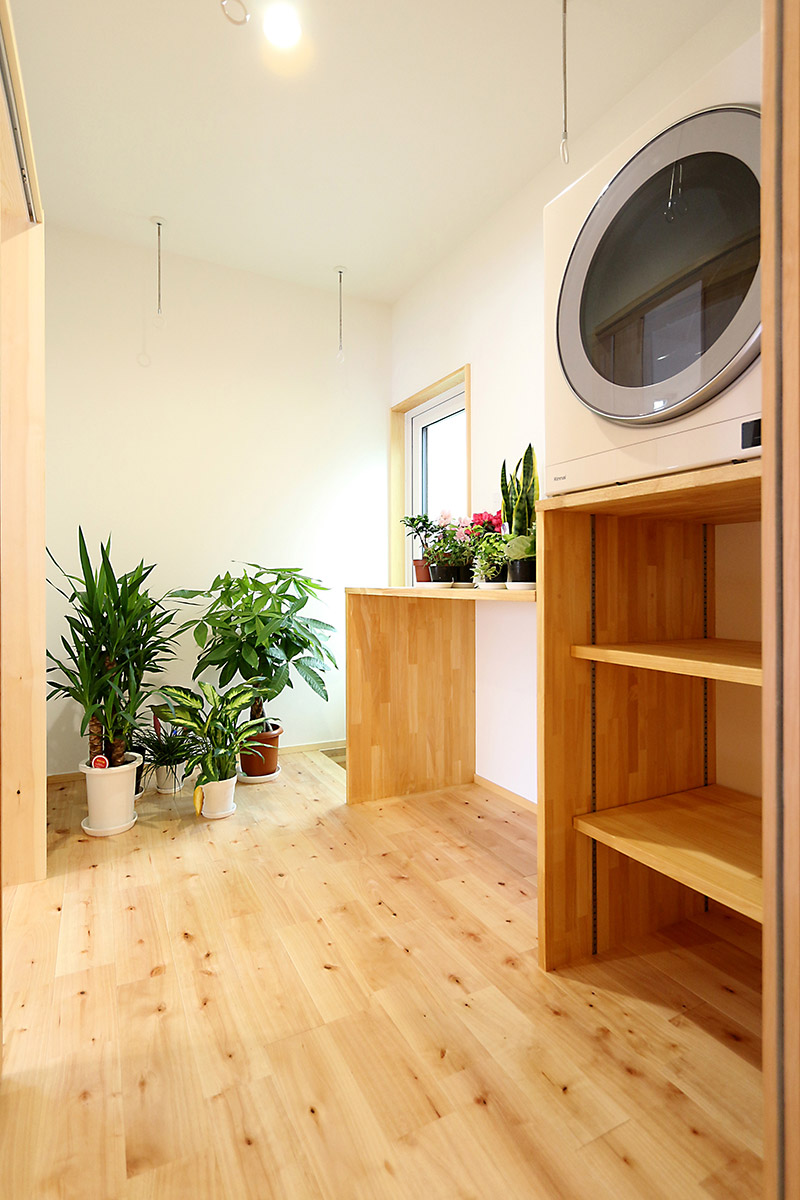 キッチンとつながる家事室には、ハンガーパイプや乾燥機、カウンターを備え、