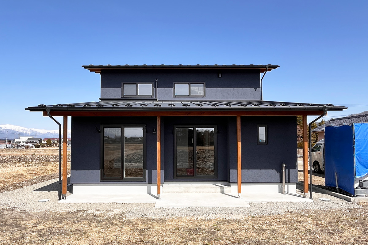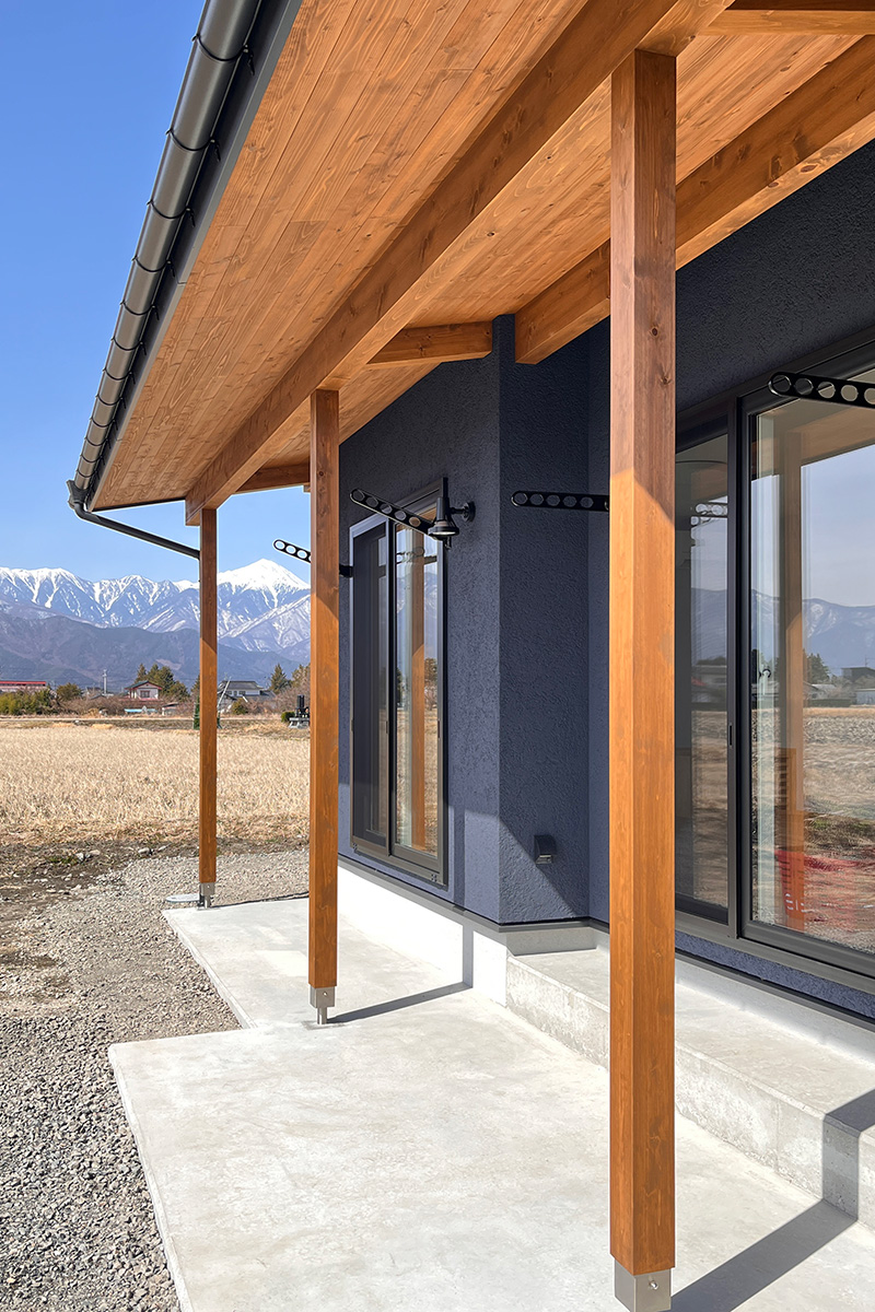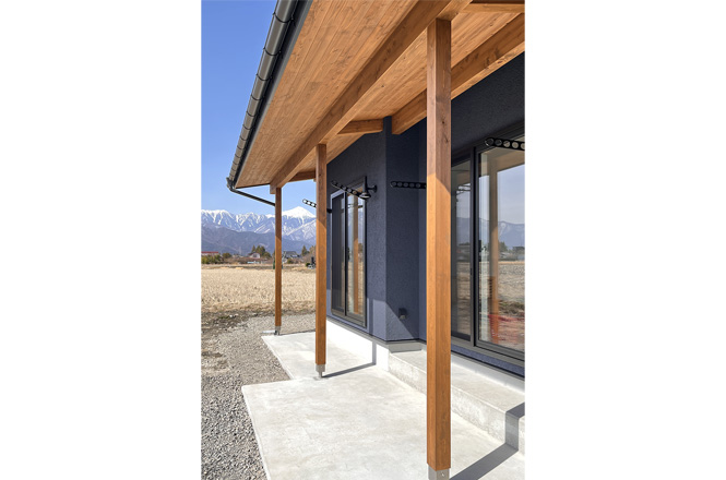 南側に開けた庭(菜園)、小さな作業場を兼ねた土間収納、体が不自由になった時の為の余裕をもった作り、2階には孫たちも気楽に迎えられる様なゲストルーム仕様の造作などなど。常念山脈から後立山連峰までの開けた眺望や遠く南アルプスの山並みを望める思い通りの家を作る事が出来ました。