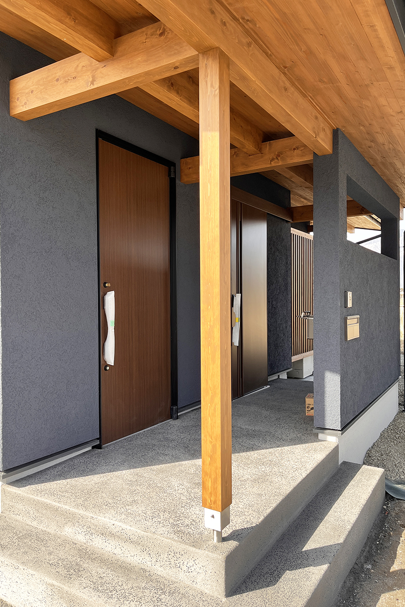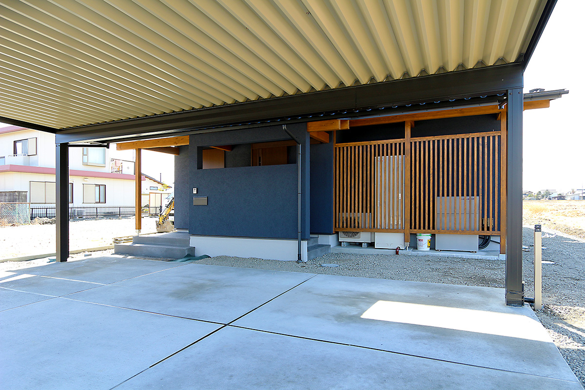 また、西側一面には、メンテナンスもしやすい屋根付き土間スペースを設け、
