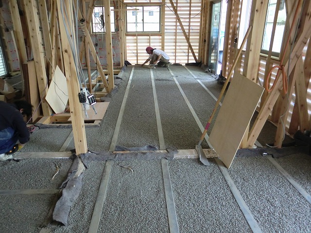 蓄熱床暖房オンドルエコノの蓄熱層の砂利が乾いたので、整地してます。