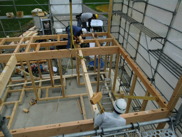 順調に作業が進み、棟が上がり、屋根の部分を作っています。