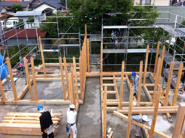 建方直前です。                        1階の管柱を立てています。