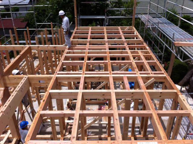 2階の床組を組んでいます。                 床組完成。