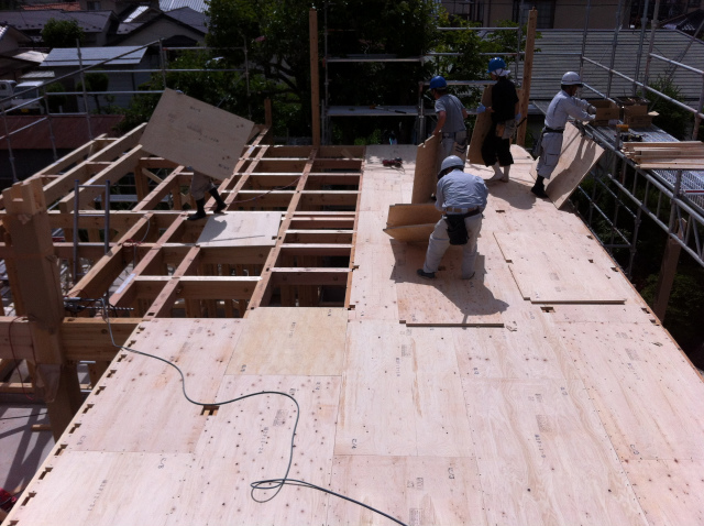 24m/mの構造用合板を張っています。          2階の管柱を立てています。