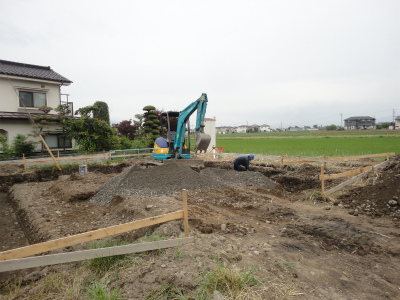 丁張をかけ、根切りをして砕石を敷き込みます。