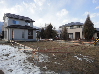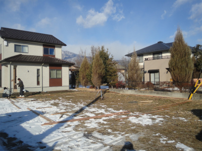 着工しました。 まずは『丁張り』と呼ばれる作業から始めます。