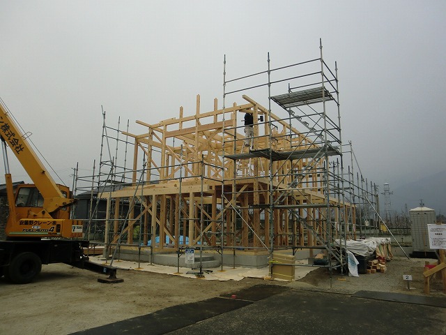 昨日からクレーン車を入れて、建て方を行いました。
