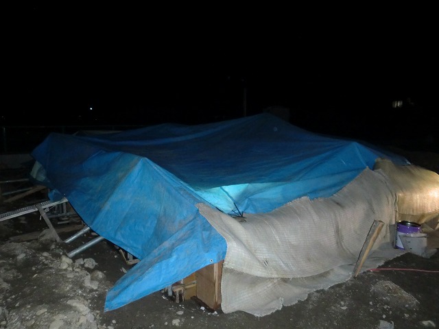 生コンに防凍材を入れ、シートと、むしろで囲い、ジェットヒーターと投光器で温めています。