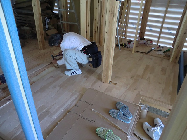 床の無垢のフローリングを張っています。