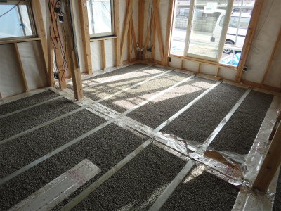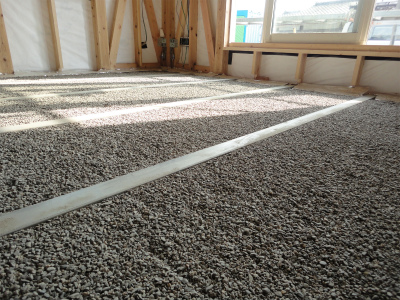 オンドルエコノの蓄熱材である砂利の乾燥が終わったので平らにならします。