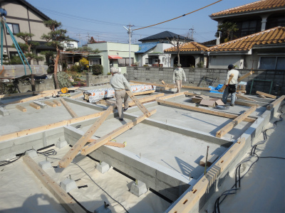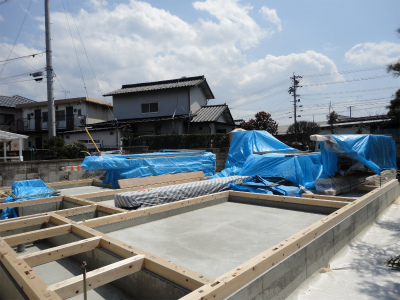 土台敷きが始まりました。 プレカットされた構造材が搬入され大工さんが次々と土台を設置していきます。 柱や梁は明日の建方の為にブルーシートで雨養生をして今日の作業は終了です。