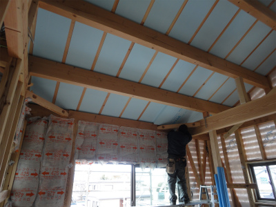 壁と屋根に断熱材を充填しました。 屋根には建方時に垂木の間に断熱材を充填していましたが 省エネルギー対策等級4を取得するために、垂木の下にもう一枚断熱材を貼り付けます。