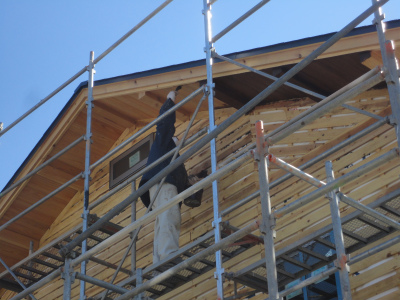 軒裏には杉の羽目板が張ってあり、その羽目板にキシラデコールという塗装材を塗っています。