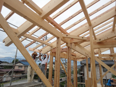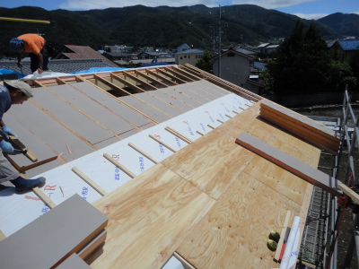 垂木を掛け、断熱材を充填し、野地板を張っていきます。