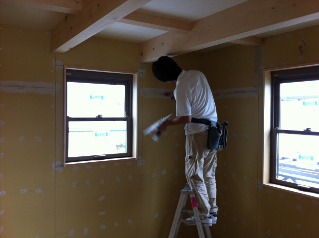 クロス工事が始まり、石膏ボードの目地をパテ処理しています。