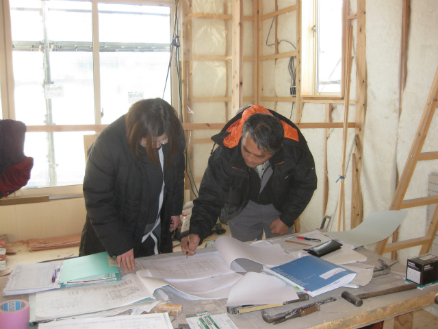 建築主さんと内外部造作工事の確認をしているところです。 当社は、設計、契約時に決められた事が施工されているか落ちがないか 建築現場でひとつひとつ確認をしています。 「すまいの建築に参加していているようで、たのしい」との声を聞いています。