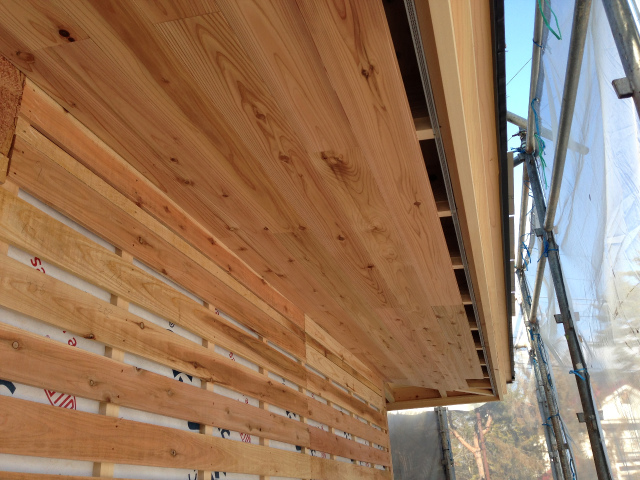 安曇野市の新築住宅 U様邸 木工事【軒裏無垢板張り】