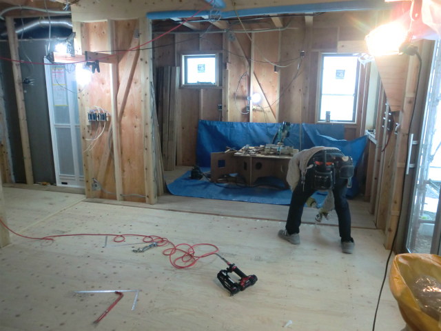 内部では大工さんが、床を張っています。