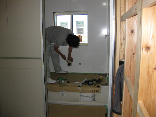 給排水の配管工事、ユニットバスの組み立て作業中です。