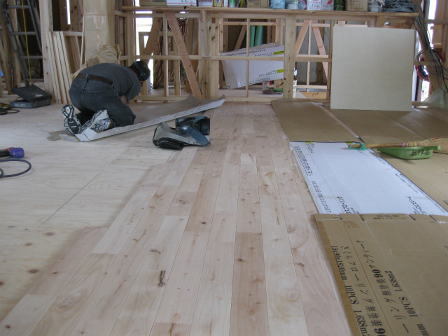 床の板(サクラの無垢)張りが始まっています。