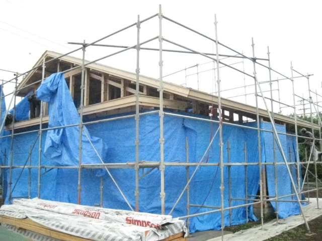 豪雨対策、日焼け対策の為、外壁にシートを張っています。