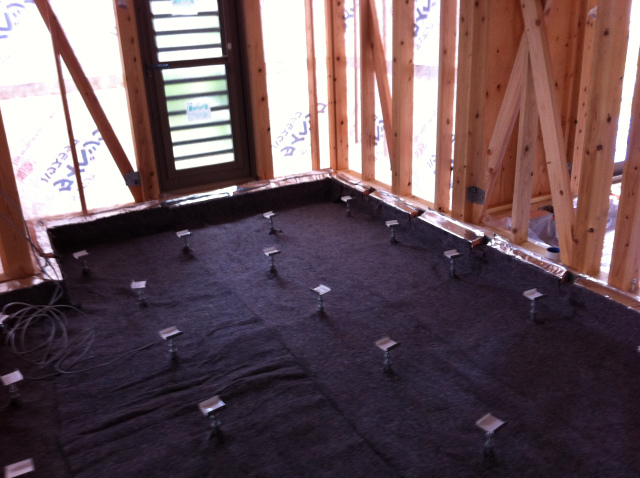 基礎のスラブに断熱材を敷き込み、その上に防湿シートとウェスを敷きました。