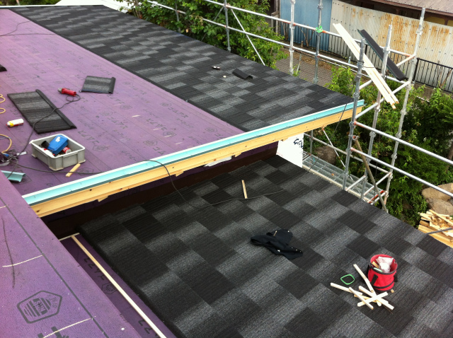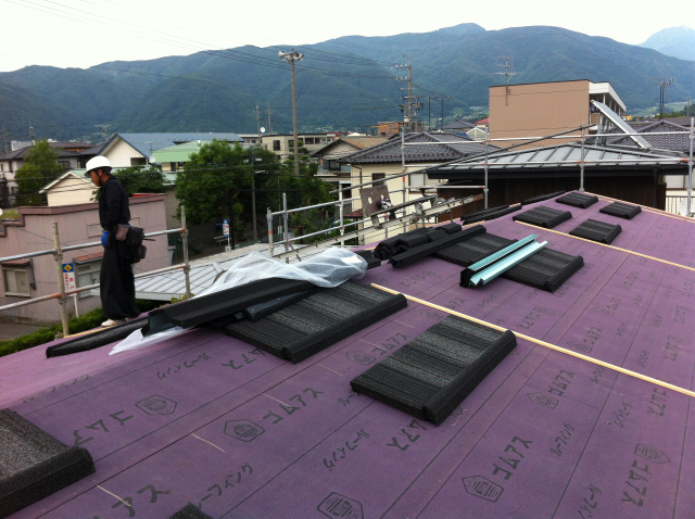 屋根材を施工しています。 今回はTルーフを言う製品を使っています。 ガルバニウム鋼板に天然石を吹付けてあります。 瓦と違い、軽くて地震にも影響を受けにくく丈夫です。