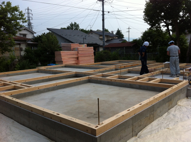大工さんと一緒に外へ出してから作業を開始し、夕方には土台を敷き終わりました。