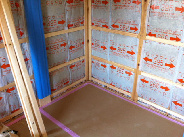 壁の断熱材を充填し、床の仕上げ材を張り傷がつかないように養生をしました。
