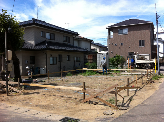 建物の位置、基礎の高さを図面を元に、敷地に写していく大事な作業です。