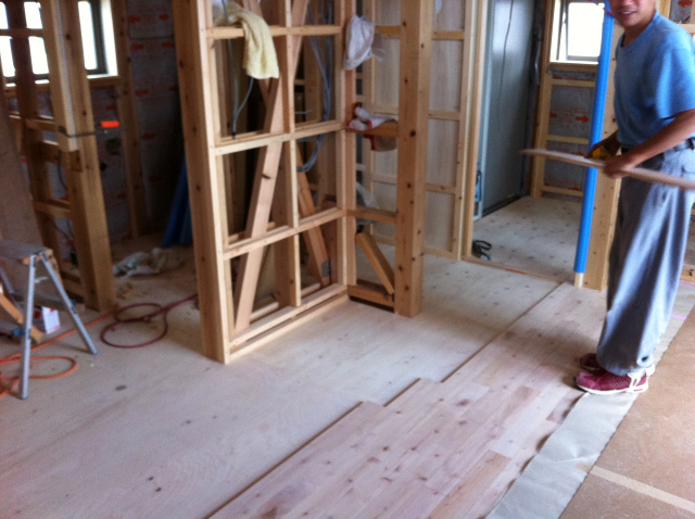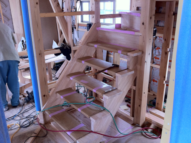無垢のフローリング・壁の断熱材・階段など、どんどん工事が進んでいます。