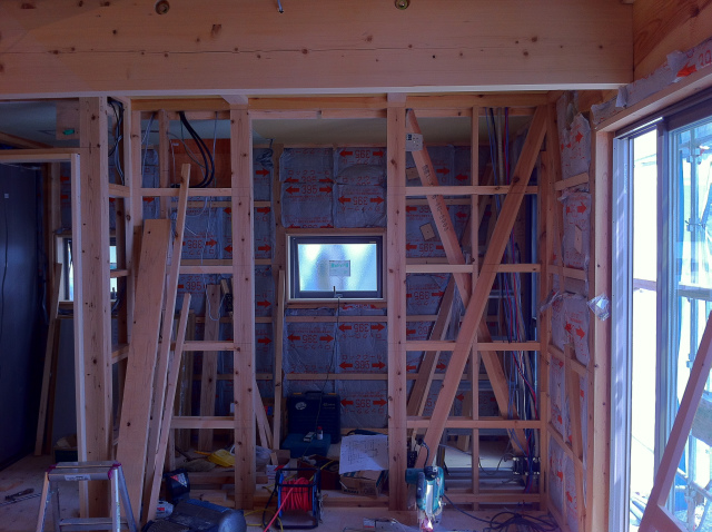 壁の断熱材を充填し、壁のボード下地を作りました。